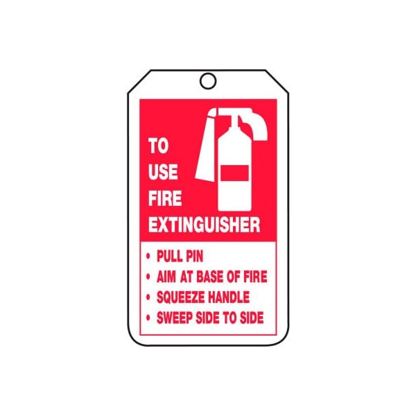 Safety tags, to use fire extinguisher..., 25/pk, rp-plastic, 5 3/4" x 3 1/4" features: safety tags are to identify temporary hazard until that hazard is eliminated or hazardous operation is complete. comply in accordance with osha 29 cfr 1910.145 and ansi z535 requirements strong and durable, flexible 15-mil thick plastic is for industrial environments resists chemicals, tears, and abrasions, plus withstands dirt and grease writable surface is mar-resistant 3/8" top hole with reinforced brass grommet to prevent pull off up to 50-lb strength 25 per pack.