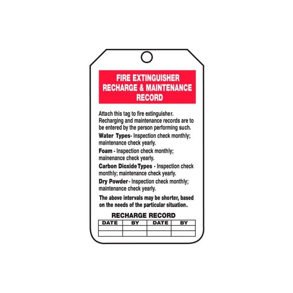 Safety tags, fire ext rechrg & maint rcrd, 25/pk, rp-plastic, 5 3/4" x 3 1/4" features: safety tags are to identify temporary hazard until that hazard is eliminated or hazardous operation is complete. comply in accordance with osha 29 cfr 1910.145 and ansi z535 requirements strong and durable, flexible 15-mil thick plastic is for industrial environments resists chemicals, tears, and abrasions, plus withstands dirt and grease writable surface is mar-resistant 3/8" top hole with reinforced brass grommet to prevent pull off up to 50-lb strength 25 per pack.