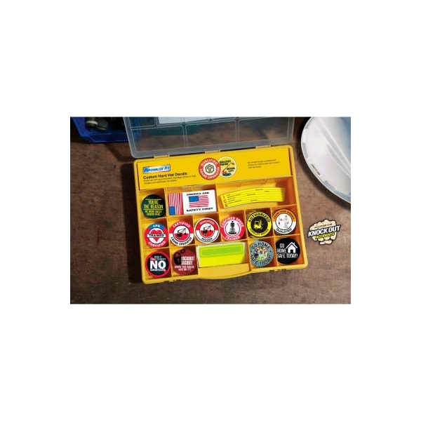 Accuform lhtl410 hard hat label kit, 14 varieties specifications: hard hat sticker kit provides employees with a variety of decals from one single kit show your safety message with colorful, bright labels on your employees' hard hats plastic container features multiple compartments and snap enclosure to secure contents decals are flexible, waterproof and feature a self-adhesive back with peel-off liner kit includes 14 different stock legends 30 each, 32 blank retro-reflective decals, 10 knockout accidents decals