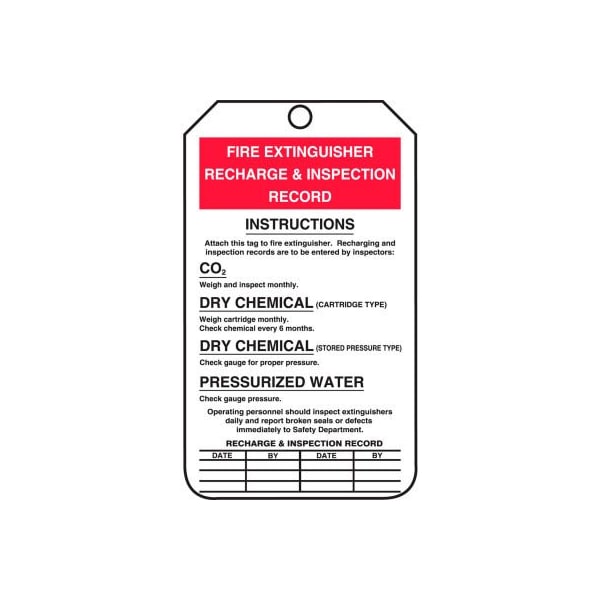 Safety tags, fire ext rechrg & inspctn..., 25/pk, rp-plastic, 5 3/4" x 3 1/4" features: safety tags are to identify temporary hazard until that hazard is eliminated or hazardous operation is complete. comply in accordance with osha 29 cfr 1910.145 and ansi z535 requirements strong and durable, flexible 15-mil thick plastic is for industrial environments resists chemicals, tears, and abrasions, plus withstands dirt and grease writable surface is mar-resistant 3/8" top hole with reinforced brass grommet to prevent pull off up to 50-lb strength 25 per pack.