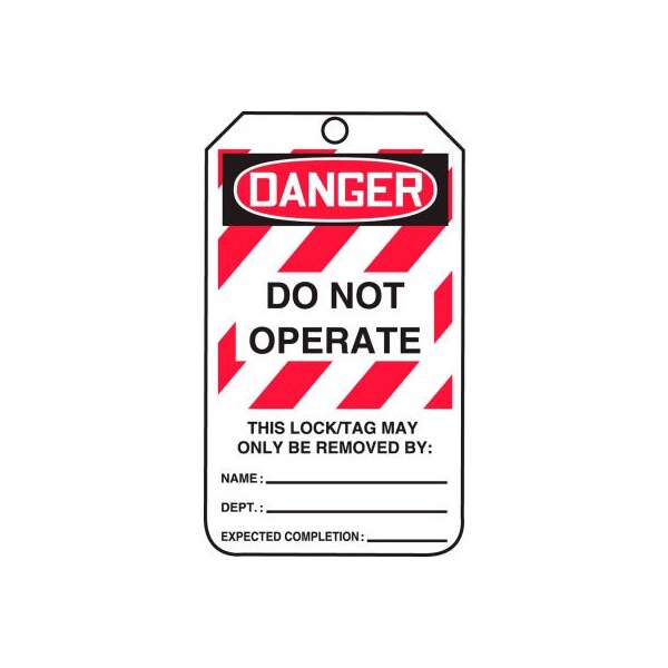 Safety tags, lockout danger do not operate, 25/pk, hs-laminate, 3-1/4"w x 5-3/4"h features: safety tags are to identify temporary hazard until that hazard is eliminated or hazardous operation is complete. comply in accordance with osha 29 cfr 1910.145 and ansi z535 requirements tear-proof 24-mil thick tags are ideal for use in harsh environments chemical-resistant to withstand dirty, greasy industrial environments matte surface is scratch resistant, yet easy to write on waterproof tags are ideal for extreme weather conditions top has 3/8" hole reinforced by a pull-proof metal grommet rated 50-lb strength 25 per pack.