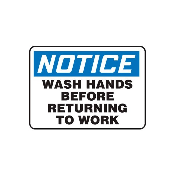 Safety sign, notice wash hands before returning to work, plastic, 7 x 10 features: signs identify and indicate potential, type, and degree of hazards that may lead to accidental injury or property damage. comply in accordance with osha 29 cfr 1910.145 and ansi z535 requirements durable plastic has slight flex that is ideal for indoor and sheltered outdoor environments printed surface has non-glare finish plastic has 50% recycled content with uv inhibitors and good impact resistance rounded corners with 3/16 mounting holes for installation