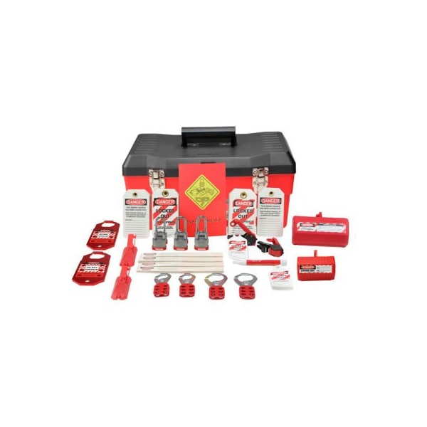 Accuform ksk345 stopout deluxe lockout kit, plastic features: lockout devices contained in a kit, making it convenient, easily accessible, and portable. kits contain a variety of lockout devices and accessories for shutting down equipment and machinery before conducting maintenance or repairs have the necessary equipment to help comply with osha 29 cfr 1910.147 safety lockout/tagout requirements durable, rugged plastic box has carry handle and room to add more components to the kit includes 1 lockout box (plastic, 19"l x 9 1/2"w x 9 1/2"h), 2 lockout scissor hasps (1" opening), 2 lockout scissor hasps (1 1/2" opening), 2 stopout aluma-tag hasps (1 1/2" opening), 3 steel padlocks (keyed differently, 3/4" shackle), 3 steel padlocks (keyed differently, 1 1/2" shackle), 100 labels for padlocks, 50 hs-laminate lockout tags, 2 stopout circuit breaker lockouts, 25 stopout circuit breaker lockout tab tags, 2 stopout universal wall switch lockouts, 1 stopout stopplug multi-plug lockout, 1 stopout stopplug 110 vac plug lockout, 1 ac voltage sensor, 1 training booklet