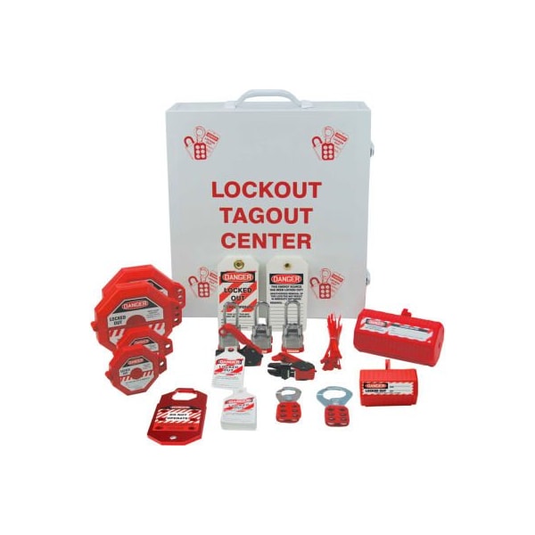 Accuform ksk369 stopout lockout/tagout cabinet center, steel features: lockout devices contained in a kit, making it convenient, easily accessible, and portable. kits contain a variety of lockout devices and accessories for shutting down equipment and machinery before conducting maintenance or repairs have the necessary equipment to help comply with osha 29 cfr 1910.147 safety lockout/tagout requirements industrial strength, steel cabinet has side hinge door with lockable clasp powder-coated for durable, scratch-resistant finish keyholes in back for wall mount, or sturdy handle for transport includes 1 cabinet (steel, 16 1/4"h x 15"w x 5 1/2"d), 1 lockout scissor hasp (1" opening), 1 lockout scissor hasp (1 1/2" opening), 1 stopout aluma-tag hasp (1 1/2" opening), 3 steel padlocks (keyed differently, 3/4" shackle), 3 steel padlocks (keyed differently, 1 1/2" shackle), 25 hs-laminate lockout tags, 25 plastic ties, 2 stopout circuit breaker lockouts, 25 stopout circuit breaker lockout tab tags, 2 stopout gate valve lockouts (1" 2 1/2" handle), 2 stopout gate valve lockouts (2 1/2" 5" handle), 1 stopout stopplug multi-plug lockout, 1 stopout stopplug 110 vac plug lockout