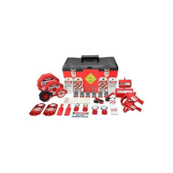 Accuform ksk700 stopout ultimate lockout kit, plastic features: lockout devices contained in a kit, making it convenient, easily accessible, and portable. kits contain a variety of lockout devices and accessories for shutting down equipment and machinery before conducting maintenance or repairs have the necessary equipment to help comply with osha 29 cfr 1910.147 safety lockout/tagout requirements durable, rugged plastic box has carry handle and room to add more components to the kit includes 1 lockout box (plastic, 19"l x 9 1/2"w x 9 1/2"h), 2 lockout scissor hasps (1" opening), 2 lockout scissor hasps (1 1/2" opening), 2 stopout aluma-tag hasps (1 1/2" opening), 6 steel padlocks (keyed differently, 3/4" shackle), 6 steel padlocks (keyed differently, 1 1/2" shackle), 100 labels for padlocks, 50 hs-laminate lockout tags, 2 stopout circuit breaker lockouts, 25 stopout circuit breaker lockout tab tags, 2 stopout universal wall switch lockouts, 1 stopout stopplug multi-plug lockout, 1 stopout stopplug 110 vac plug lockout, 1 stopout ball valve lockout (3/8" 1 1/4" valve), 1 stopout ball valve lockout (1 1/2" 2" valve), 1 stopout gate valve lockout (1" 2 1/2" handle), 1 stopout gate valve lockout (2 1/2" 5" handle), 1 stopout gate valve lockout (5" 6 1/2" handle), 1 stopout cinch cable lockout, 1 training booklet, 1 magnetic label (3 1/2" x 5", danger equipment locked...)