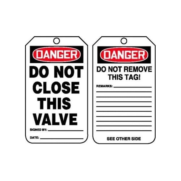 Accuform Safety Tag, DANGER DO NOT CLOSE THIS VALVE Legend, 534 in Height, 314 in Width, RPPlastic, 38 in Hole, Reinforced PullProof Metal Grommet