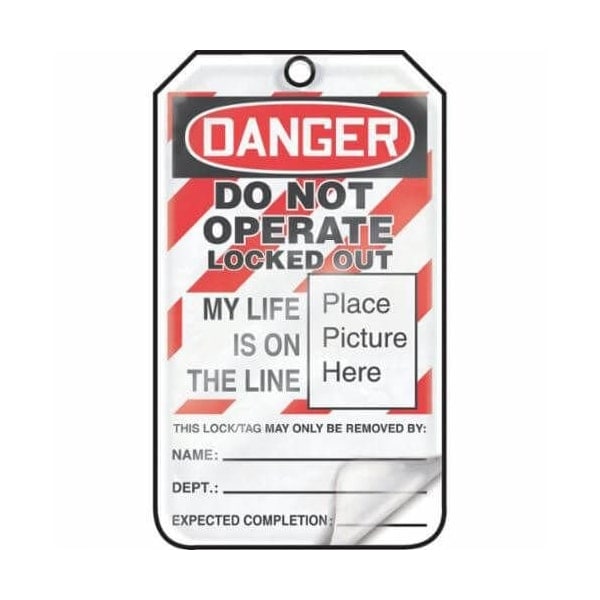 Accuform Safety Tag, SelfLaminating, DANGER DO NOT OPERATE LOCKED OUT MY LIFE IS ON THE LINE Legend, BlackRedWhite LegendBackground, 534 in Height, 314 in Width, PFCardstock, 38 in Hole, Reinforced PullProof Metal Grommet
