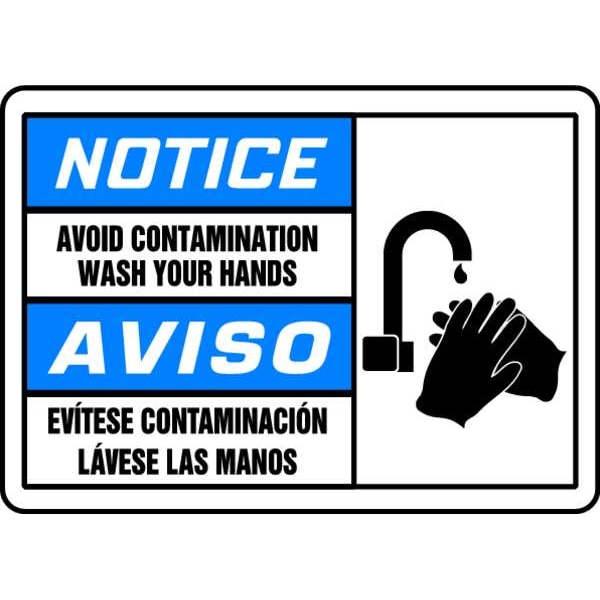 Notice Sign, Sign Subject Matter Wash Hands, Height 3-1/2 In., Width 5 In., Sign Material Vinyl, Sign Mounting Style Surface, Legend Avoid Contamination Wash Your Hands, Printed Language English, Spanish, Package Quantity 5