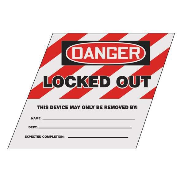 Ball Valve Lockout Label, Horizontal Rectangle, Number of Printed Sides 1, English, Sign Format Traditional OSHA, Sign Legend Locked Out This Device May Only Be Removed By: Name: Dept: Expected Completion:, Sign Legend Background Color Red, White, Sign Legend Style Text