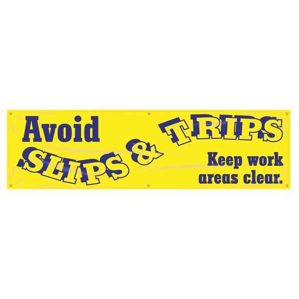 Banner, Avoid Slips & Trips, Keep Work Areas Clear, 28 in H x, 96 in W, Poly Sheeting