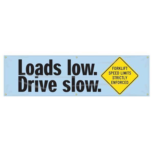 Banner, Loads Low. Drive Slow. Forklift Speed Limits Strictly Enforced, 28 in H x, 96 in W