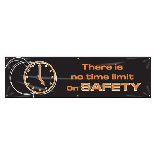 Banner, Shape Horizontal Rectangle, Safety Banner Legend There Is No Time Limit On Safety, Sign Legend Style Symbol and Text, Printed Language English, Background Color Black, Number of Printed Sides 1, Width 96 in, Height 28 in, Thickness 0.013 in