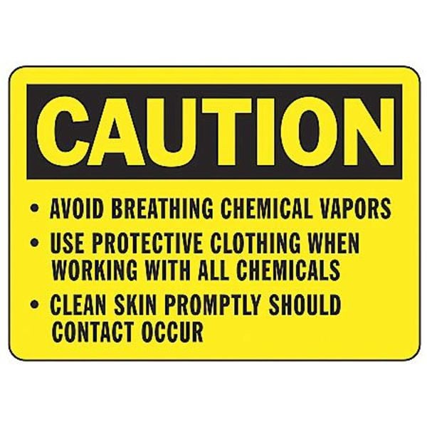 Caution Sign, Sign Subject Matter Personal Protection, Height 10 in, Width 14 in, Sign Material Plastic, Header Caution, Legend Avoid Breathing Chemical Vapors -Use Protective Clothing When Working With All Chemicals -Clean Skin Promptly Should Contact Occur, Printed Language English, Sign Shape Rectangle