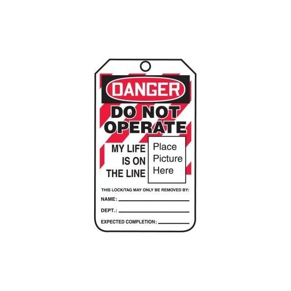 Safety Tags, DANGER DO NOT OPERATE MY LIFE IS ON, 5.75in x 3.25in, Self-Laminating PF-Cardstock, 25PK