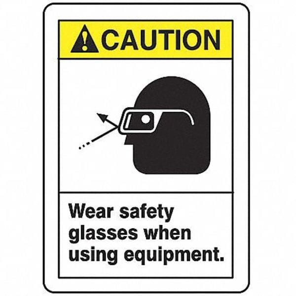 Caution Sign, Sign Subject Matter Personal Protection, Height 14 In., Width 10 In., Sign Material Aluminum, Header Caution, Legend Wear Safety Glasses When Using Equipment., Printed Language English, Sign Shape Rectangle