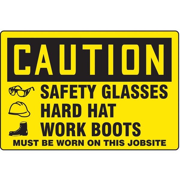 Caution Sign, Sign Subject Matter Personal Protection, Height 24 in, Width 36 in, Sign Material Plastic, Header Caution, Legend Safety Glasses Hard Hat Work Boots Must Be Worn On This Jobsite, Printed Language English, Sign Shape Rectangle
