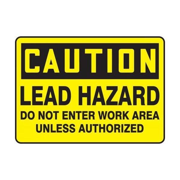 Accuform Caution Sign, Header CAUTION, Text Legend, Legend LEAD HAZARD DO NOT ENTER WORK AREA UNLESS AUTHORIZED, 004 in Aluminum, Hole Mounting, 7 in Height, 10 in Width, Black on Yellow SignYellow on Black Header LegendBackgroundSafety Signs identify and indicate potential, type and degree of hazards that may lead to accidental injury or property damage Aluminum signs withstand washdowns, harsh elements, abusive conditions and feature good chemical, abrasion and impact resistance Aluminum is excellent for indoor and outdoor usage, making it ideal for a wide variety of industrialstrength applications