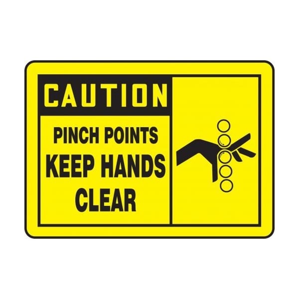Accuform Caution Sign, CAUTION Header, TextSymbol Legend, PINCH POINTS KEEP HANDS CLEAR GRAPHIC Legend, 0055 in Plastic, 10 in Height, 14 in Width, Black on Yellow LegendBackgroundSafety Signs identify and indicate potential, type and degree of hazards that may lead to accidental injury or property damage Plastic signs are semiflexible, made with 50 recycled content and ideal for indoor and shortterm, sheltered outdoor environments Plastic signs feature good impact resistance, UV inhibitors and enough flex to mount on slightly curved areas