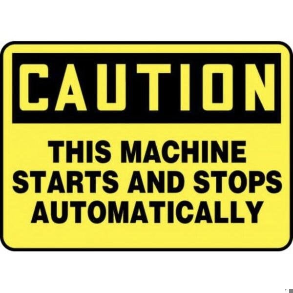 Accuform Caution Sign, Header CAUTION, Text Legend, Legend THIS MACHINE STARTS AND STOPS AUTOMATICALLY, 6 mil Adhesive Vinyl, 10 in Height, 14 in WidthSafety Signs identify and indicate potential, type, and degree of hazards that may lead to accidental injury or property damage Duallayered Adhesive DuraVinyl delivers exceptional flexibility and performance, outperforming standard vinyl Printed image is protected by a highgloss UV protective coating Adhesive DuraVinyl is durable, even in the toughest indoor and outdoor conditions, and adheres to most smooth, curved, and irregular surfaces