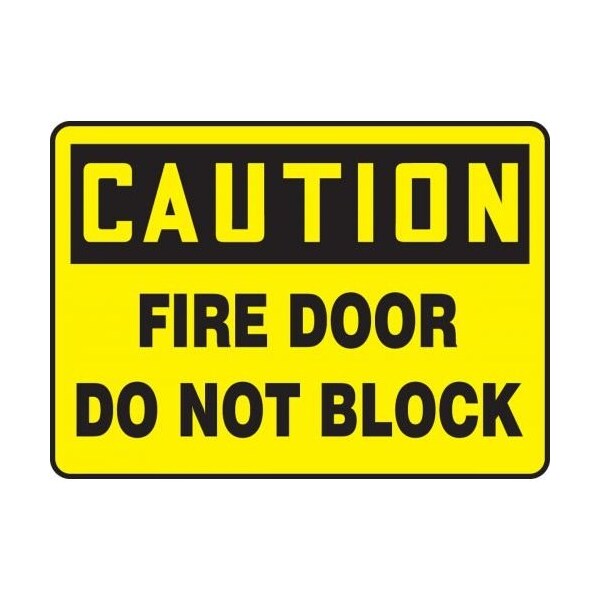 Accuform Caution Sign, Rectangle, Header CAUTION, Text Legend, Legend FIRE DOOR DO NOT BLOCK, 004 in Aluminum, Hole Mounting, 10 in Height, 14 in Width, YellowBlack on BlackYellow LegendBackgroundSafety Signs identify and indicate potential, type and degree of hazards that may lead to accidental injury or property damage Aluminum signs withstand washdowns, harsh elements, abusive conditions and feature good chemical, abrasion and impact resistance Aluminum is excellent for indoor and outdoor usage, making it ideal for a wide variety of industrialstrength applications