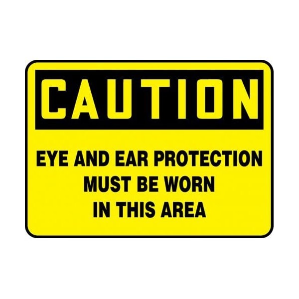 Accuform Caution Sign, Header CAUTION, Text Legend, Legend EYE AND EAR PROTECTION MUST BE WORN IN THIS AREA, 0055 in Plastic, 10 in Height, 14 in Width, Black on Yellow LegendBackgroundSafety Signs identify and indicate potential, type and degree of hazards that may lead to accidental injury or property damage Plastic signs are semiflexible, made with 50 recycled content and ideal for indoor and shortterm, sheltered outdoor environments Plastic signs feature good impact resistance, UV inhibitors and enough flex to mount on slightly curved areas