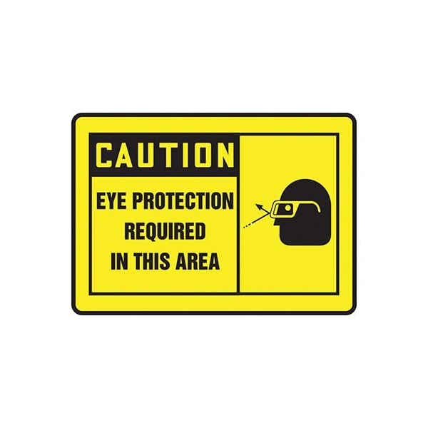 Accuform Caution Sign, CAUTION Header, TextSymbol Legend, EYE PROTECTION REQUIRED IN THIS AREA GRAPHIC Legend, 004 in Aluminum, 7 in Height, 10 in Width, Black on Yellow LegendBackgroundSafety Signs identify and indicate potential, type and degree of hazards that may lead to accidental injury or property damage Aluminum signs withstand washdowns, harsh elements, abusive conditions and feature good chemical, abrasion and impact resistance Aluminum is excellent for indoor and outdoor usage, making it ideal for a wide variety of industrialstrength applications