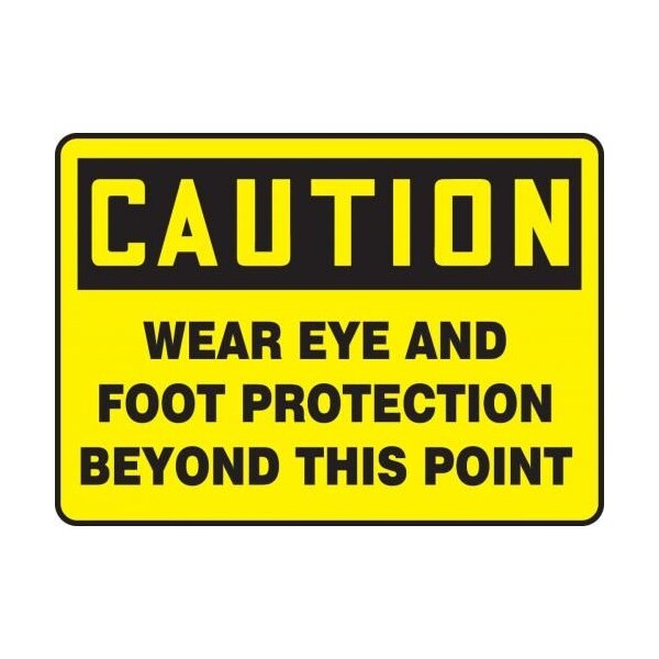 Accuform Caution Sign, Header CAUTION, Text Legend, Legend WEAR EYE AND FOOT PROTECTION BEYOND THIS POINT, 4 mil Adhesive Vinyl, 7 in Height, 10 in Width, Black on Yellow LegendBackgroundSafety Signs identify and indicate potential, type and degree of hazards that may lead to accidental injury or property damage Adhesive Vinyl is the ideal choice for a variety of indoor and sheltered outdoor, marking needs Easily mounts to all curved areas such as pipes, poles and secondary containers Adhesive Vinyl signs feature a printed matte surface, moistureresistance and scored backing for quick peeloff and application