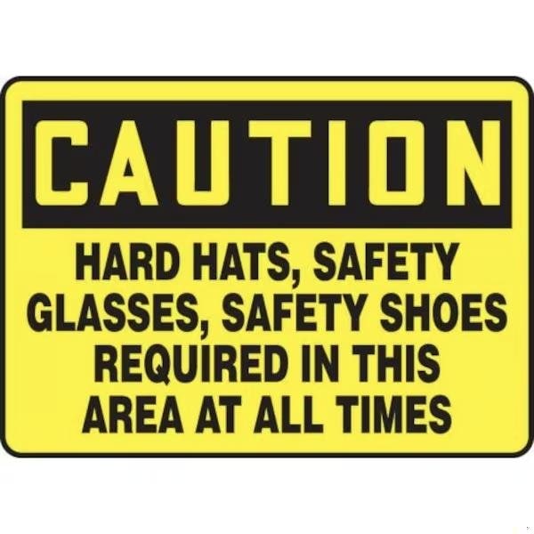 Accuform Caution Sign, Header CAUTION, Text Legend, Legend HARD HATS, SAFETY GLASSES, SAFETY SHOES REQUIRED IN THIS AREA AT ALL TIMES, 6 mil Adhesive DuraVinyl, 10 in Height, 14 in WidthSafety Signs identify and indicate potential, type, and degree of hazards that may lead to accidental injury or property damage Duallayered Adhesive DuraVinyl delivers exceptional flexibility and performance, outperforming standard vinyl Printed image is protected by a highgloss UV protective coating Adhesive DuraVinyl is durable, even in the toughest indoor and outdoor conditions, and adheres to most smooth, curved, and irregular surfaces