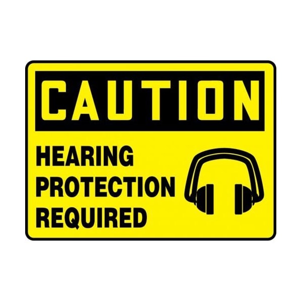 Accuform Caution Sign, CAUTION Header, TextSymbol Legend, HEARING PROTECTION REQUIRED GRAPHIC Legend, 004 in Aluminum, 7 in Height, 10 in Width, Black on Yellow LegendBackgroundSafety Signs identify and indicate potential, type and degree of hazards that may lead to accidental injury or property damage Aluminum signs withstand washdowns, harsh elements, abusive conditions and feature good chemical, abrasion and impact resistance Aluminum is excellent for indoor and outdoor usage, making it ideal for a wide variety of industrialstrength applications