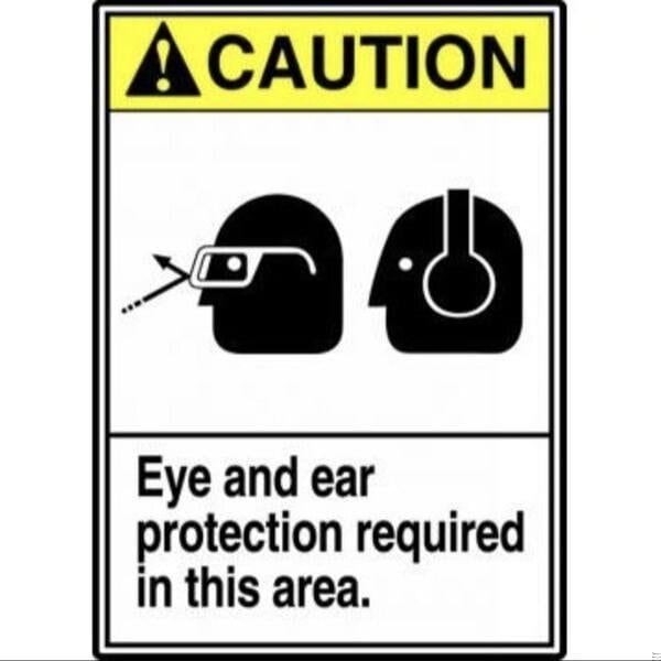 Accuform Caution Sign, CAUTION Header, TextSymbol Legend, ANSI EYE AND EAR PROTECTION REQUIRED IN THIS AREA GRAPHIC Legend, 0055 in Plastic, 14 in Height, 10 in WidthSafety Signs identify and indicate potential, type and degree of hazards that may lead to accidental injury or property damage Plastic signs are semiflexible, made with 50 recycled content and ideal for indoor and shortterm, sheltered outdoor environments Plastic signs feature good impact resistance, UV inhibitors and enough flex to mount on slightly curved areas