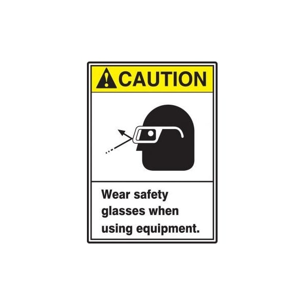 Accuform Caution Sign, CAUTION Header, TextSymbol Legend, ANSI WEAR SAFETY GLASSES WHEN USING EQUIPMENT GRAPHIC Legend, 004 in Aluminum, 14 in Height, 10 in Width, BlackYellow on white LegendBackgroundSafety Signs identify and indicate potential, type and degree of hazards that may lead to accidental injury or property damage Aluminum signs withstand washdowns, harsh elements, abusive conditions and feature good chemical, abrasion and impact resistance Aluminum is excellent for indoor and outdoor usage, making it ideal for a wide variety of industrialstrength applications