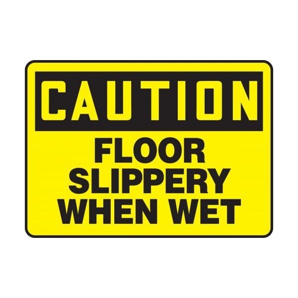 Accuform Caution Sign, Header CAUTION, Text Legend, Legend FLOOR SLIPPERY WHEN WET, 0055 in Plastic, 10 in Height, 14 in Width, Black on Yellow LegendBackgroundSafety Signs identify and indicate potential, type and degree of hazards that may lead to accidental injury or property damage Plastic signs are semiflexible, made with 50 recycled content and ideal for indoor and shortterm, sheltered outdoor environments Plastic signs feature good impact resistance, UV inhibitors and enough flex to mount on slightly curved areas