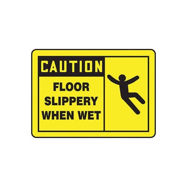 Accuform Caution Sign, CAUTION Header, TextSymbol Legend, FLOOR SLIPPERY WHEN WET GRAPHIC Legend, 004 in Aluminum, 10 in Height, 14 in Width, Black on Yellow LegendBackgroundSafety Signs identify and indicate potential, type and degree of hazards that may lead to accidental injury or property damage Aluminum signs withstand washdowns, harsh elements, abusive conditions and feature good chemical, abrasion and impact resistance Aluminum is excellent for indoor and outdoor usage, making it ideal for a wide variety of industrialstrength applications