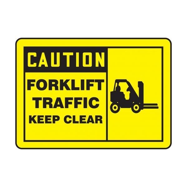Accuform Caution Sign, CAUTION Header, TextSymbol Legend, FORKLIFT TRAFFIC KEEP CLEAR GRAPHIC Legend, 004 in Aluminum, 10 in Height, 14 in Width, Black on Yellow LegendBackgroundSafety Signs identify and indicate potential, type and degree of hazards that may lead to accidental injury or property damage Aluminum signs withstand washdowns, harsh elements, abusive conditions and feature good chemical, abrasion and impact resistance Aluminum is excellent for indoor and outdoor usage, making it ideal for a wide variety of industrialstrength applications