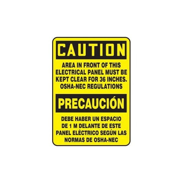 Accuform Caution Sign, Bilingual, Header CAUTION, Text Legend, Legend AREA in FRONT OF THIS ELECTRICAL PANEL MUST BE KEPT CLEAR FOR 36 INCHES OSHANEC REGULATIONSPRECAUCION DEBE HABER UN ESPACIO DE 1 M DELANTE, 0055 in Plastic, 14 in Height, 10 in Width, Black on Yellow LegendBackgroundSafety Signs identify and indicate potential, type and degree of hazards that may lead to accidental injury or property damage Plastic signs are semiflexible, made with 50 recycled content and ideal for indoor and shortterm, sheltered outdoor environments Plastic signs feature good impact resistance, UV inhibitors and enough flex to mount on slightly curved areas