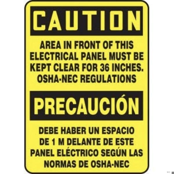Accuform Caution Sign, Bilingual, Header CAUTION, Text Legend, Legend AREA in FRONT OF THIS ELECTRICAL PANEL MUST BE KEPT CLEAR FOR 36 INCHES OSHANEC REGULATIONSPRECAUCION DEBE HABER UN ESPACIO DE 1 M DELANTE, 004 in Aluminum, 20 in Height, 14 in WidthSafety Signs identify and indicate potential, type and degree of hazards that may lead to accidental injury or property damage Aluminum signs withstand washdowns, harsh elements, abusive conditions and feature good chemical, abrasion and impact resistance Aluminum is excellent for indoor and outdoor usage, making it ideal for a wide variety of industrialstrength applications