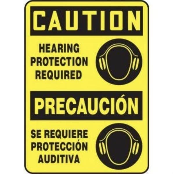 Accuform Caution Sign, CAUTION Header, TextSymbol Legend, HEARING PROTECTION REQUIREDPRECAUCION SE REQUIERE PROTECCION AUDITIVA GRAPHIC Legend, 6 mil Adhesive DuraVinyl, 14 in Height, 10 in WidthSafety Signs identify and indicate potential, type and degree of hazards that may lead to accidental injury or property damage Duallayered Adhesive DuraVinyl delivers exceptional flexibility and performance, outperforming standard vinyl Printed image is protected by a highgloss UV protective coating Adhesive DuraVinyl is durable, even in the toughest indoor and outdoor conditions and adheres to most smooth, curved and irregular surfaces