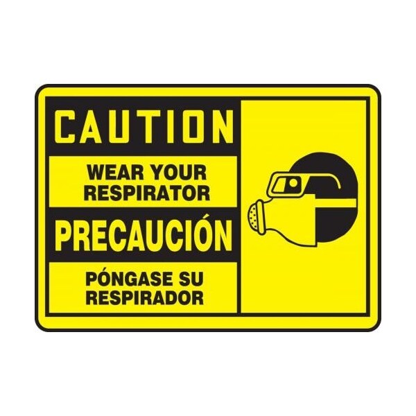 Accuform Caution Sign, CAUTION Header, TextSymbol Legend, WEAR YOUR RESPIRATORPRECAUCION PONGASE SU RESPIRADOR GRAPHIC Legend, 004 in Aluminum, 10 in Height, 14 in Width, Black on Yellow LegendBackgroundSafety Signs identify and indicate potential, type and degree of hazards that may lead to accidental injury or property damage Aluminum signs withstand washdowns, harsh elements, abusive conditions and feature good chemical, abrasion and impact resistance Aluminum is excellent for indoor and outdoor usage, making it ideal for a wide variety of industrialstrength applications