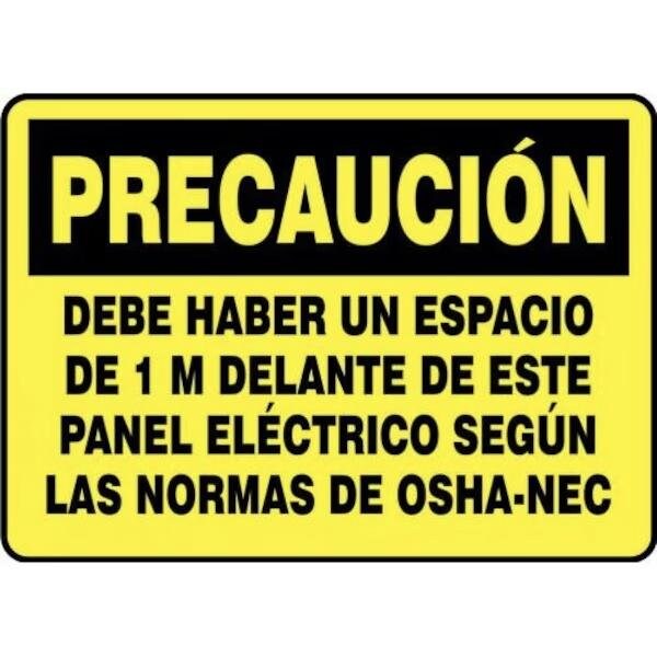 Accuform Caution Sign, Header PRECAUCION, Text Legend, Legend DEBE HABER UN ESPACIO DE 1 M DELANTE DE ESTE PANEL ELECTRICO SEGUN LAS NORMAS DE OSHANEC, 0055 in Plastic, 10 in Height, 14 in WidthSafety Signs identify and indicate potential, type and degree of hazards that may lead to accidental injury or property damage Plastic signs are semiflexible, made with 50 recycled content and ideal for indoor and shortterm, sheltered outdoor environments Plastic signs feature good impact resistance, UV inhibitors and enough flex to mount on slightly curved areas