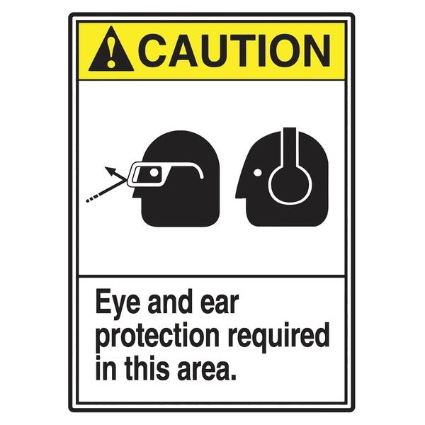 Caution Sign, Sign Subject Matter Personal Protection, Height 14 in, Width 10 in, Sign Material Vinyl, Sign Mounting Style Adhesive Surface, Header Caution, Legend Eye And Ear Protection Required In This Area., Printed Language English, Sign Shape Rectangle