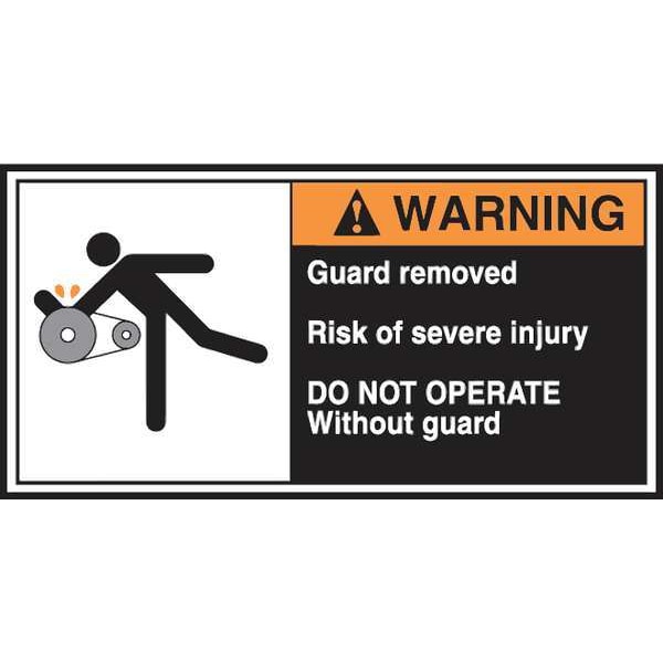 CEMA Label, Horizontal Rectangle, Number of Printed Sides 1, English, Sign Format ANSI/OSHA Format, Sign Legend Guard Removed Risk Of Severe Injury Do Not Operate Without Guard, Sign Legend Background Color Black, White, Sign Legend Style Symbol and Text, Package Quantity 5