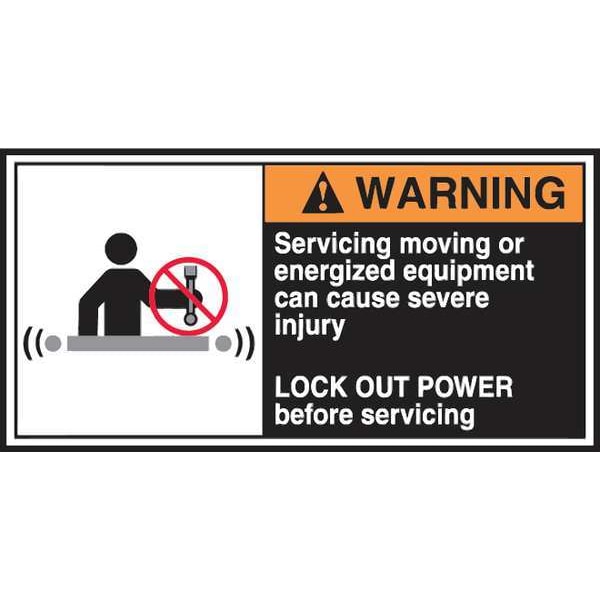 CEMA Label, Horizontal Rectangle, Number of Printed Sides 1, English, Sign Format ANSI/OSHA Format, Sign Legend Servicing Moving Or Energized Equipment Can Cause Severe Injury Lock Out Power Before Servicing, Sign Legend Background Color Black, White, Sign Legend Style Symbol and Text, Package Quantity 5