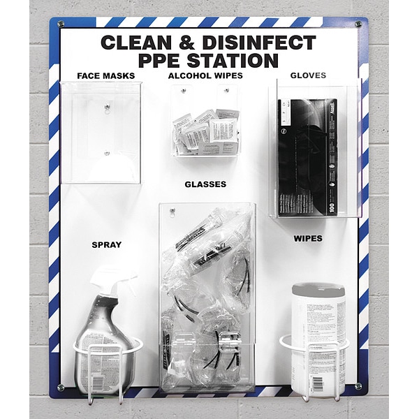Clean and Disinfect PPE Station, Overall Height 32 in, Overall Width 27 in, Number of Compartments 6, Mounting Style Wall, Dispenses Alcohol Wipes, Cleaning/Disinfecting Spray Bottle, Disinfecting Wipes, Face Masks, Gloves, Safety Glasses, Material Aluminum, Color Blue/White, Includes (1)Disposable Gloves Space Holder, (1)Safety Glasses Space Holder, (1)Face Masks Space Holder, (1)Disinfecting Wipes Space Holder, (1)Cleaning/Disinfecting Spray Bottle Space Holder, (1)Alcohol Wipes Space Holder
