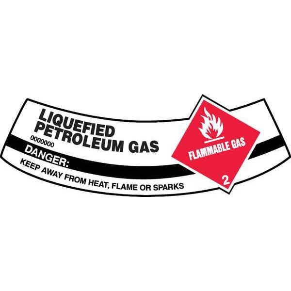 Cylinder Label, Arch, Number of Printed Sides 1, English, Sign Format Other Format, Sign Legend Petroleum Gases Liquid Flammable Gas Danger Keep Away From Heat, Flame Or Sparks, Sign Legend Background Color Black, Red, White, Sign Legend Style Symbol and Text