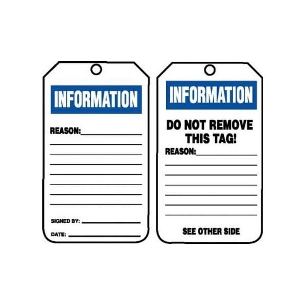 Accuform Safety Tag, INFORMATION Legend, BlueBlackWhite LegendBackground, 534 in Height, 314 in Width, PFCardstock, 38 in Hole, Reinforced Metal GrommetInspection and status record tags at a glance on the tag, be able to see the last recorded inspection and status of equipment Use record tags with multiple line spaces to record equipment and machinery inspection, servicing, an maintenance activities over a period of time Status tags mark the changed situation of equipment needing attention and action required Tags allow you to record information on location Workers are better informed about the status of equipment Audits can be performed more efficiently when information can be sought right along with the equipment