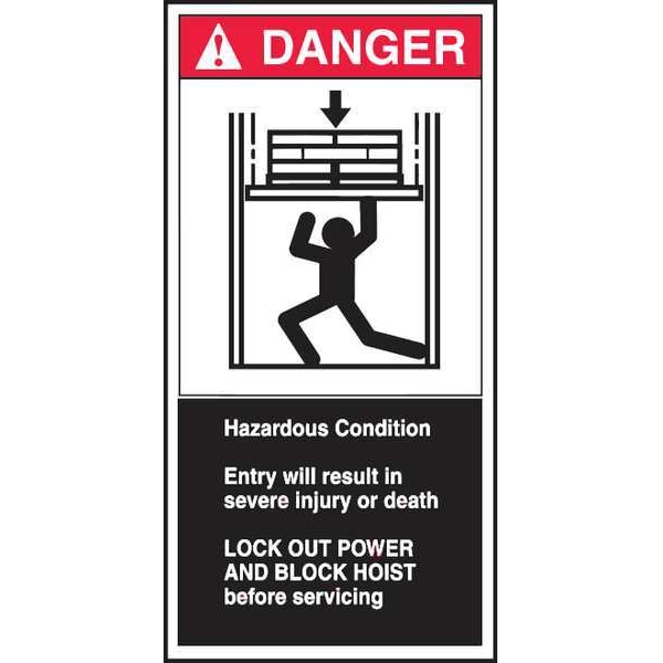 CEMA Label, Vertical Rectangle, Number of Printed Sides 1, English, Sign Format ANSI/OSHA Format, Sign Legend Hazardous Condition Entry Will Result In Severe Injury Or Death Lockout Power And Block Hoist Before Servicing, Sign Legend Background Color Black, White, Sign Legend Style Symbol and Text, Package Quantity 5