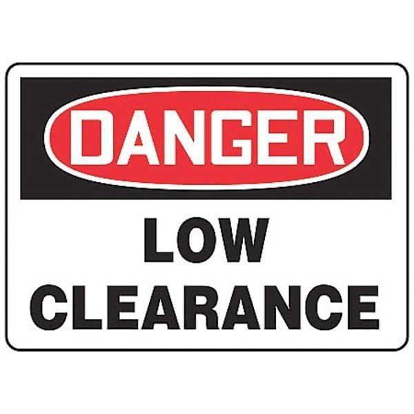 Danger Sign, Sign Subject Matter Overhead Clearance, Height 7 In., Width 10 In., Sign Material Vinyl, Sign Mounting Style Adhesive Surface, Header Danger, Legend Low Clearance, Printed Language English, Sign Shape Rectangle