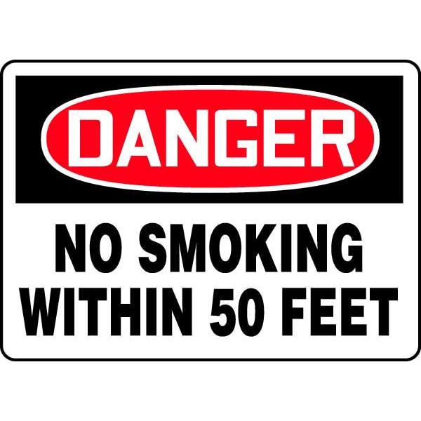 Danger No Smoking Sign, Sign Subject Matter No Smoking, Height 7 in, Width 10 in, Sign Material Vinyl, Sign Mounting Style Adhesive Surface, Header Danger, Legend No Smoking Within 50 Feet, Printed Language English, Sign Shape Rectangle