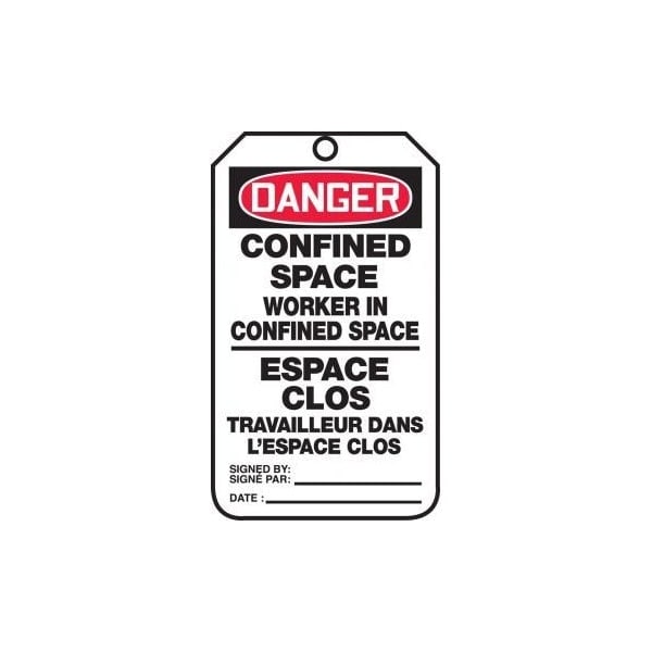 French Bilingual Safety Tags, DANGER CONFINED SPACE WORKER IN CONFINED SPACE, 5.75in x 3.25in, RP-Plastic, 5PK
