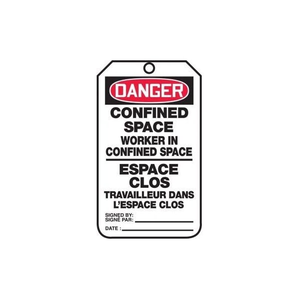 French Bilingual Safety Tags, DANGER CONFINED SPACE WORKER IN CONFINED SPACE, 5.75in x 3.25in, PF-Cardstock, 25PK